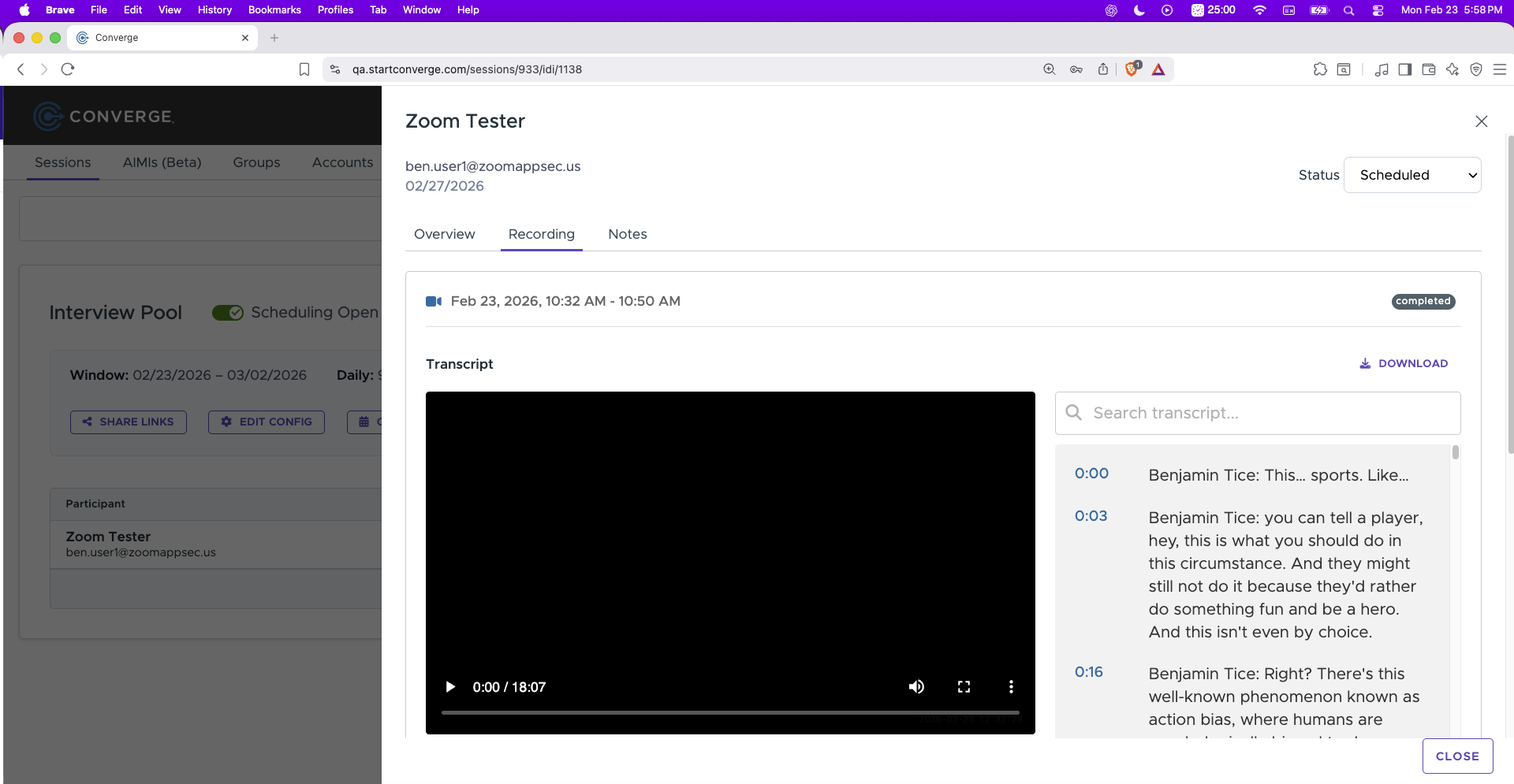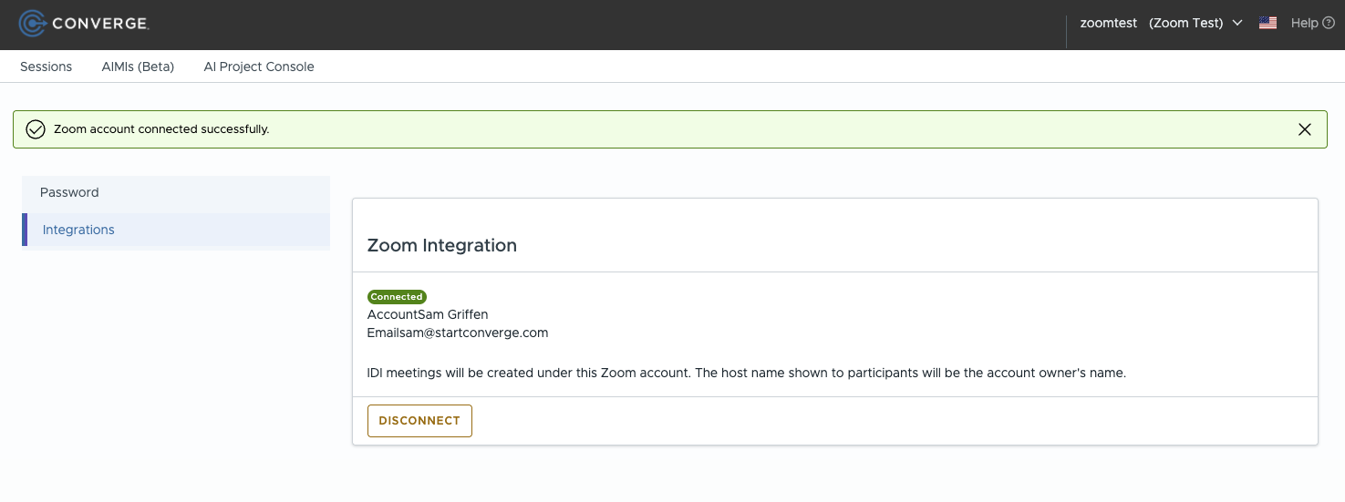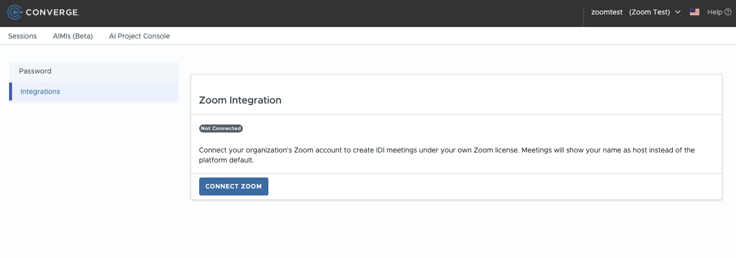 Converge now supports per-organization Zoom account connections for IDI (In-Depth Interview) meetings executed via the Zoom Meetings API.