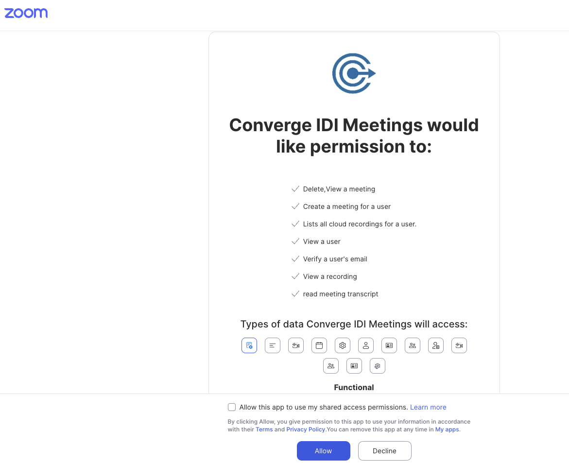 The Zoom OAuth app requests the following permissions: