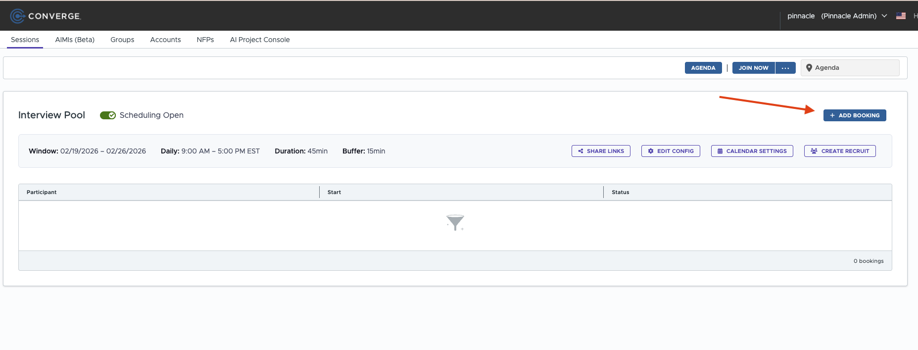 Leave all other defaults and click "Create Session". You'll be directed to the agenda page where then you can schedule your interviewee and see the meeting get created. Click "Schedule Interviewes"
