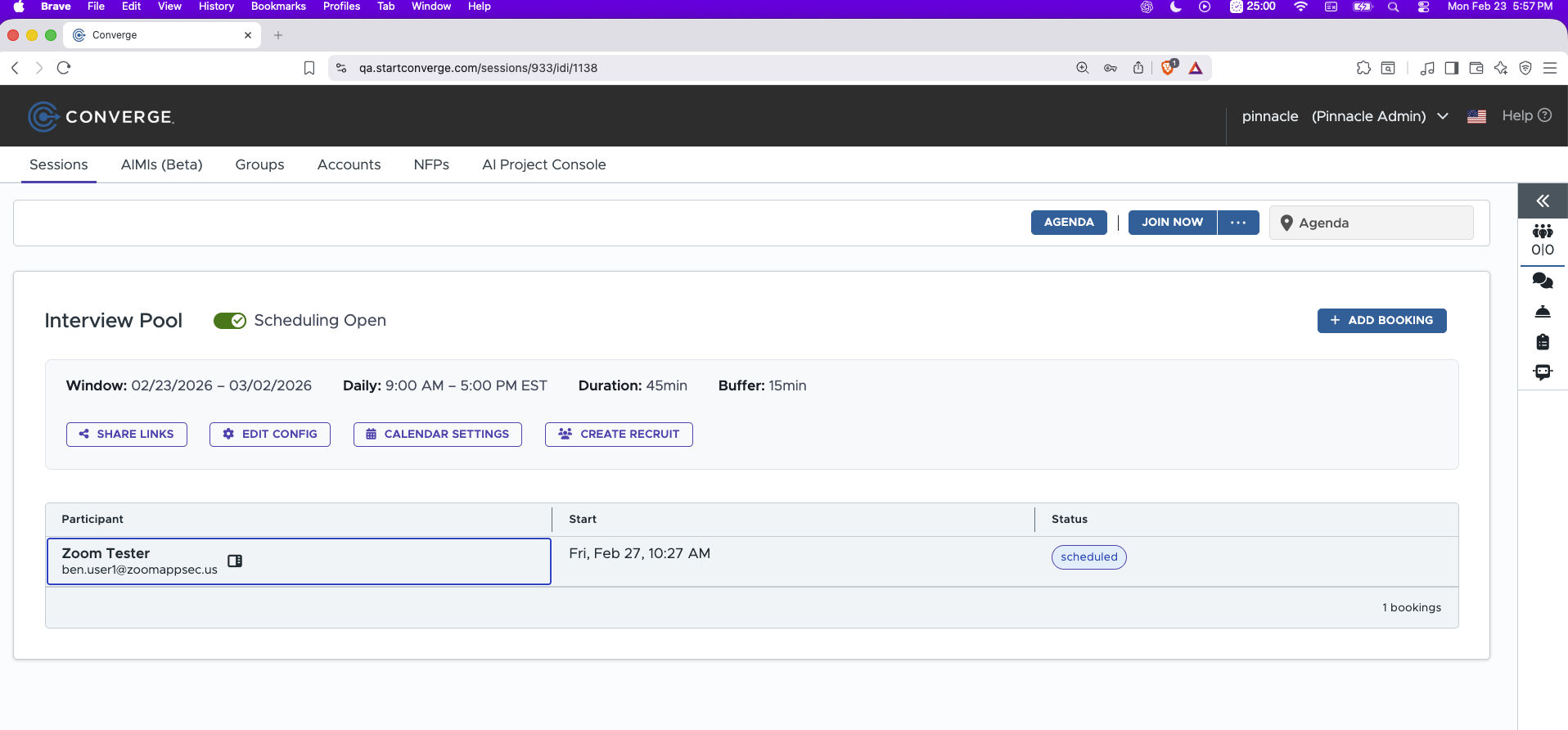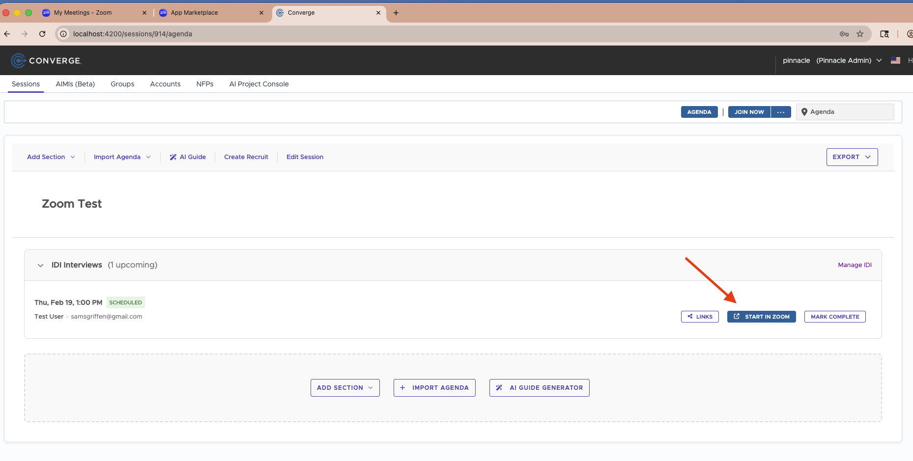 Back on the Converge Agenda side, when the time comes you are ready to start the zoom meeting.
